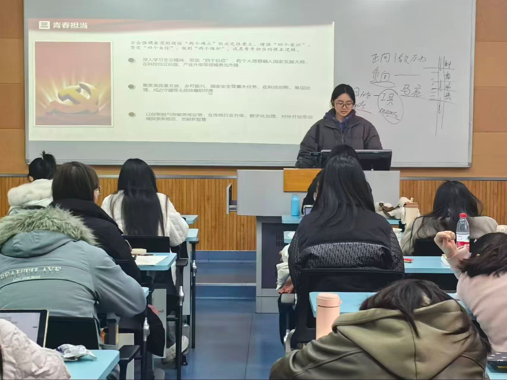 学习过程中,现场气氛活跃,互动频繁。当谈到“青春担当”时,一位同学结合专业提问:“我们行政管理专业的学生,如何在基层治理中落实全会精神?”主持人回应道,这正是全会精神的实践要求,鼓励大家未来在岗位上运用数字化思维提升治理效能,在解决群众急难愁盼问题中践行人民至上理念,将个人成长融入国家治理体系和治理能力现代化的伟大进程。