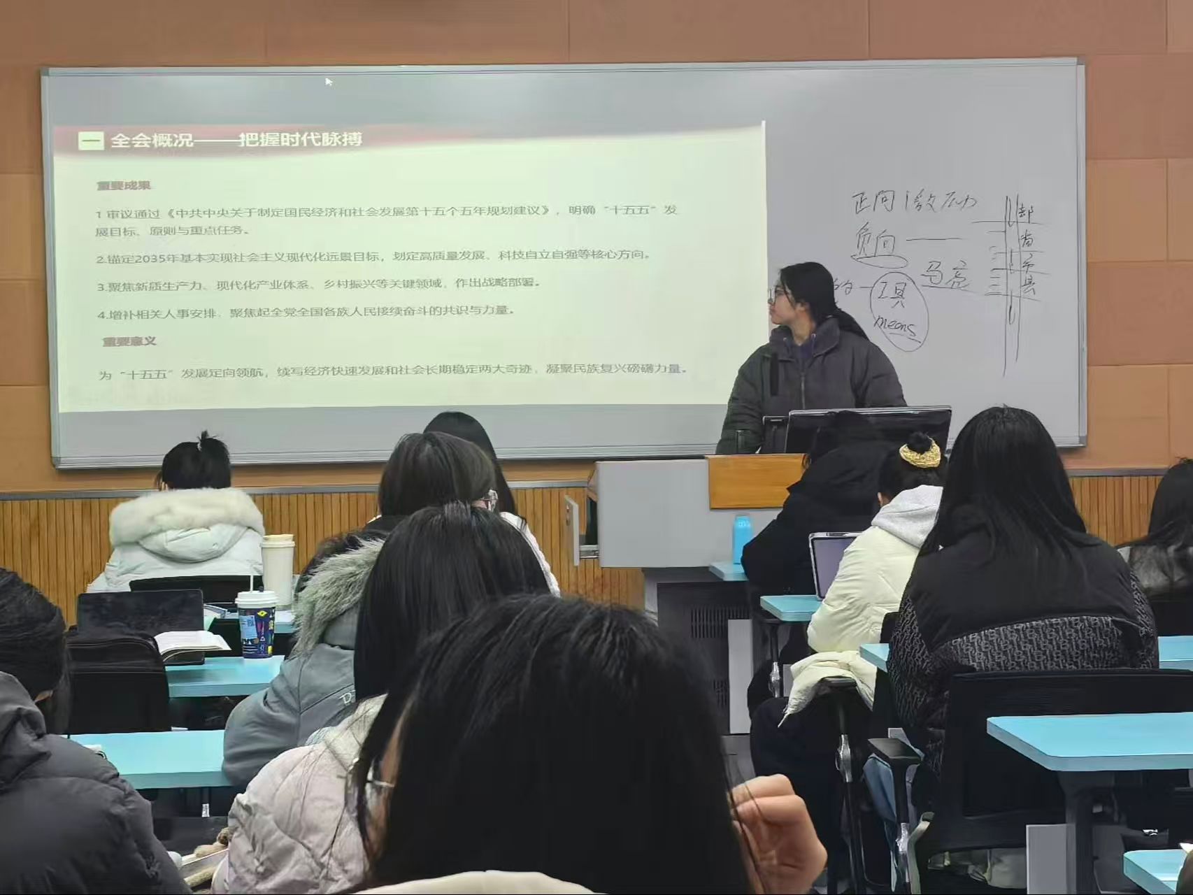 活动伊始,主持人通过生动的讲解,带领同学们回顾了全会的时代背景与核心议程,重点解读了为“十五五”发展定向领航的《中共中央关于制定国民经济和社会发展第十五个五年规划的建议》。学习内容深入阐释了全会锚定2035年远景目标,聚焦高质量发展、科技自立自强、新质生产力培育及乡村振兴等关键领域作出的战略部署,帮助团员青年深刻把握了“十五五”这一现代化关键时期的指导方针与主要任务。